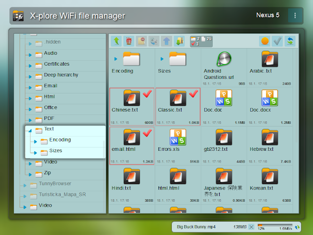 X- plore le permite ver el interior de su dispositivo Android. Y también fuera. Se trata de un explorador de doble panel, hay dos carpetas que se muestran en la misma hora, y el funcionamiento común, como la copia de archivos se realizan a partir de un panel a otro.